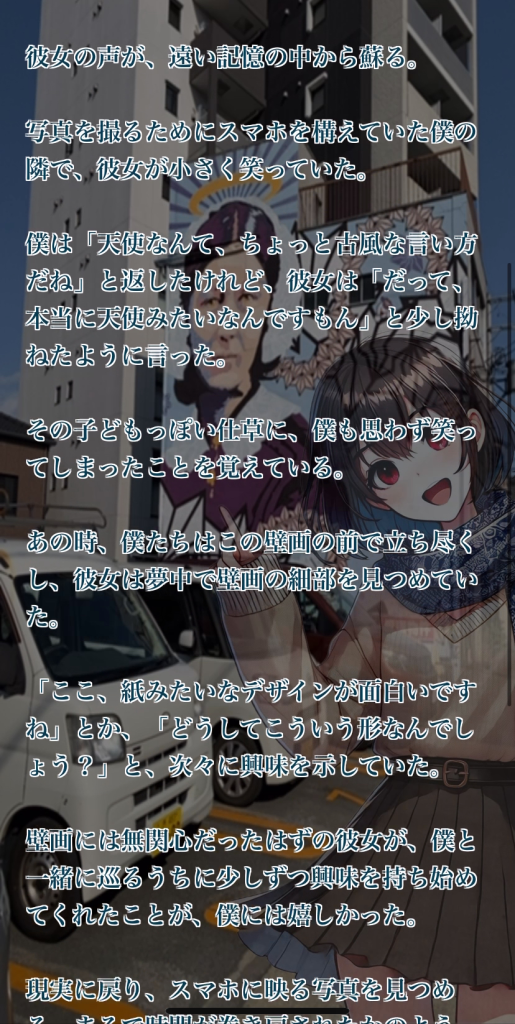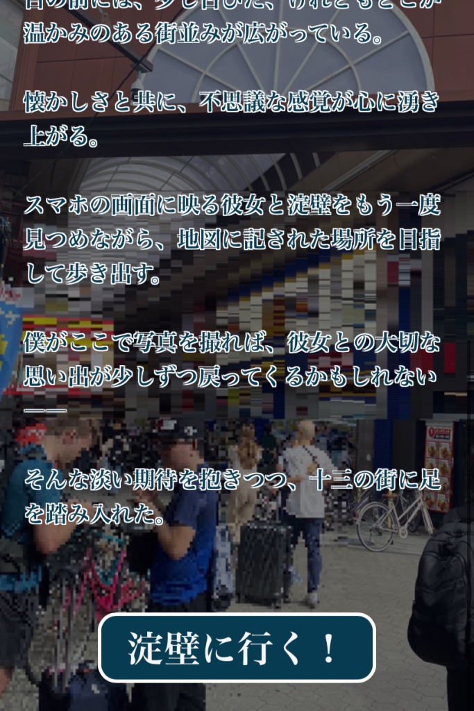 あらすじでは,記憶喪失の主人公が彼女との記憶を取り戻すために,過去に彼女と見に行った淀壁を撮影するために,十三に降り立ち,淀壁を探しに行きます.