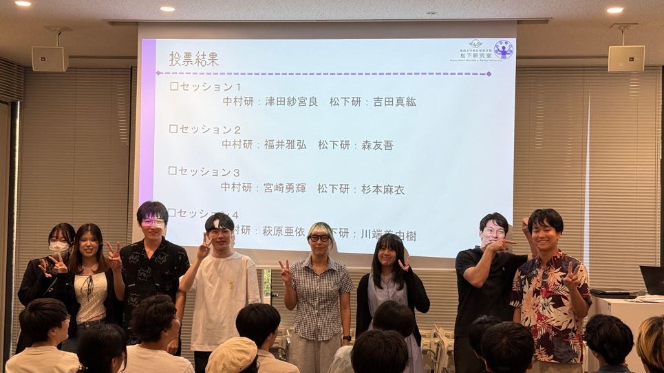 みなさんこんにちは!M1の野田樹希です.8/21(木)に,明治大学の中村研究室との合同研究会を行いました.今年も明治大学中野キャンパスにお邪魔させていただきました.中村研から32名,松下研からは18名の学生がポスターでの研究発表を行い,互いの研究について活発な議論ができました.中村研究室の方々から様々な視点から鋭いご意見をいただいたので,今後研究を進めるにおいてとても有益な研究会になったと感じられます!