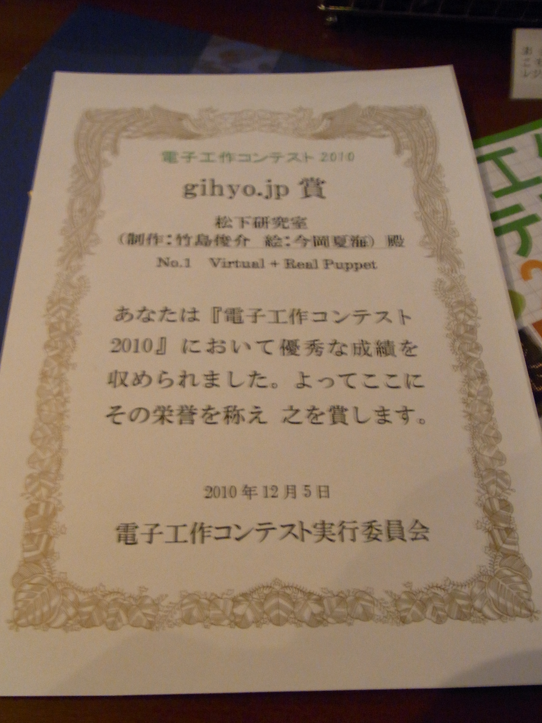 イベント / 一期生 2010-12-06 電子工作コンテスト 2010 (gihyo.jp 賞受賞) 2010年12月5日(日) に東京カルチャーセンター(東京都江東区)にて、「電子工作コンテスト2010」が開催されました。松下ゼミからは B4 の竹島俊介(プログラム)+今岡夏海(デザイン)の「Virtual+Real … 続きを読む > |