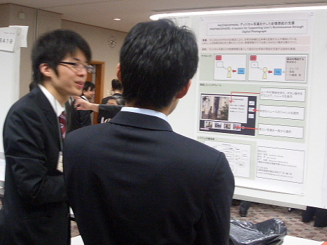 一期生 / 教員 / 研究活動 2010-06-16 第24回人工知能学会全国大会 2010年6月9日から11日に長崎ブリックホールで開催された第24回人工知能学会全国大会の「フィールドマイニング」セッション(9日)で、学部4年生の田中和広くんが発表しました。題目は「「記憶」と「記録」を緩やかに繋ぐメ … 続きを読む > |
