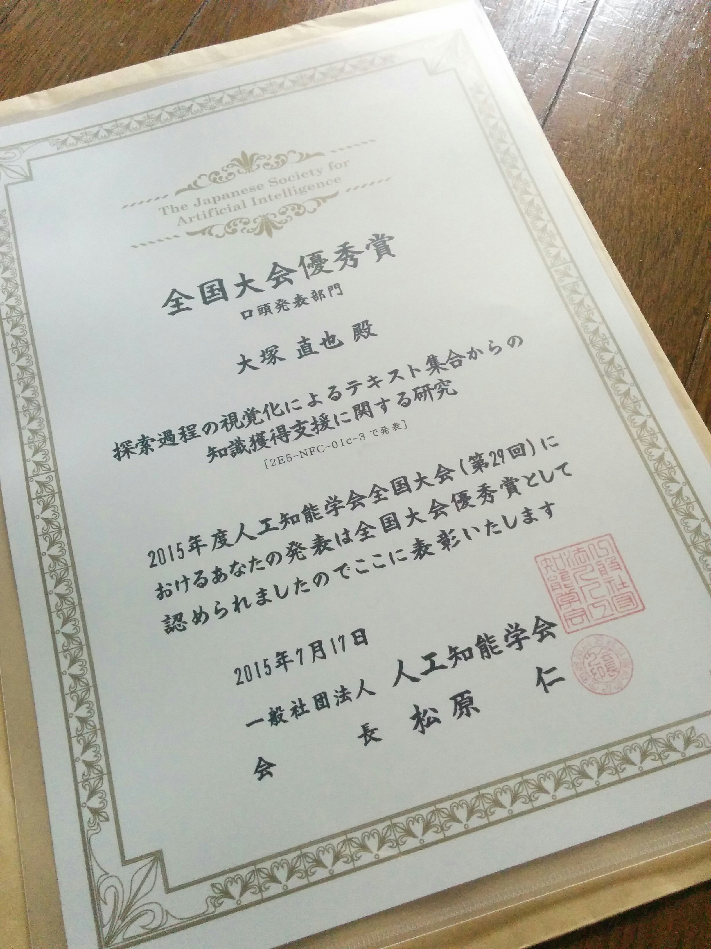 三期生 / 受賞 2015-08-10 人工知能学会全国大会優秀賞を受賞しました 先日函館で行われた人工知能学会全国大会の優秀賞に、大塚直也君(2014年度卒業)の研究が選ばれました。本研究は、大塚君が修士論文で取り組んだテキストマイニング統合環境 TETDM の拡張に関する研究テーマであり、さまざま… 続きを読む > |