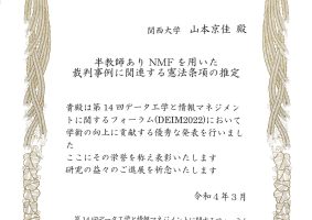 十一期生 / 十二期生 / 十期生 / 受賞 / 研究活動 / 高橋知奈 2021-09-10 東海関西データベースワークショップ2021で発表しました&受賞しました こんにちは、B4の高橋です. 2021年9月5日(日),6日(月)に開催された,東海関西データベースワークショップ2021に参加致しました.今年もコロナウィルスの影響でオンラインでの開催となりました.関西大学,甲南大学,… 続きを読む > |