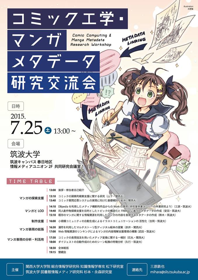 イベント / 五期生 / 六期生 / 四期生 2015-08-06 コミック工学・マンガメタデータ研究交流会を開催しました 2015年7月25日に、筑波大学にて、コミック工学・マンガメタデータ研究交流会を開催しました。この研究交流会は、筑波大学図書館情報メディア研究科の杉本・永森研究室と共同で開催したものです。企業の方やプロの漫画家さんにもご… 続きを読む > |