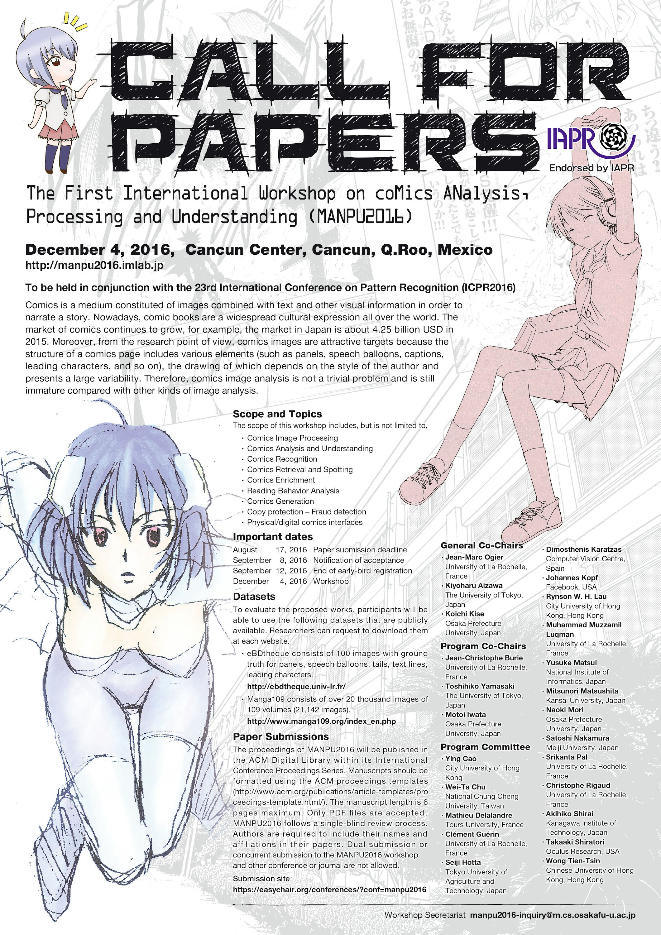 教員 / 研究活動 2016-07-14 国際ワークショップ MANPU2016 のご案内 2016 年 12 月 4 日に、メキシコのリゾートであるカンクンにて、コミックの工学的研究に関する国際ワークショップ MANPU2016を開催することになりました。ICPR2016 の併設ワークショップです。是非投稿を… 続きを読む > |