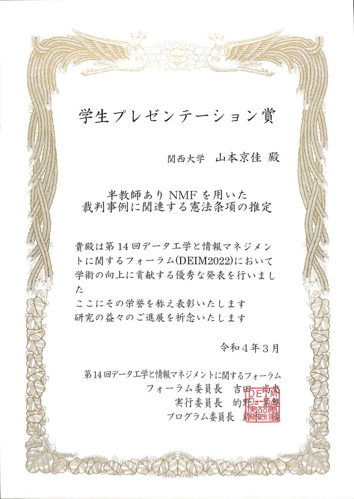 第14回データ工学と情報マネジメントに関するフォーラムに研究室メンバー5名が参加しました.またM2の山本が学生プレゼンテーション賞に選出されました.