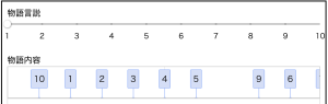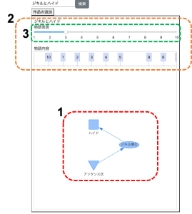 2:物語言説の時間軸に配置されたスライダーは,登場人物間の関係性が変化,登場人物が増減した話数を範囲に指定し,物語のトータルの登場人物間の関係性の変化をユーザの手で確認可能にしており,スライダーを動かすと,可視化される関係性が変化していきます. 3:物語言説と物語内容のそれぞれの時間軸を設置し,これらの時間の一致や相違など,どんな時間構造であるか確認可能にしています.物語言説は1話,2話と,順番に時間が配置されていますが,物語内容の時間軸を確認すると,10が1よりも前の軸に配置されていることから,10は過去の出来事であることがひと目でわかります.    現在は,どのように見せると物語構造を把握できるか,可視化に主眼を置いています.