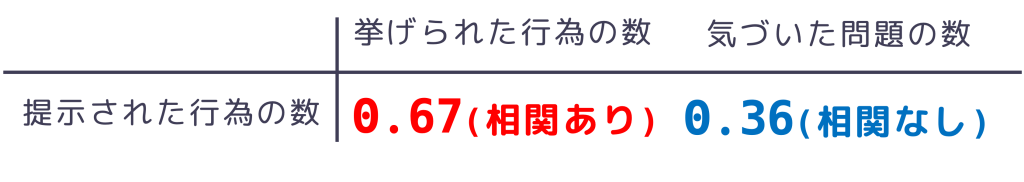 これは,問題を発見するときの選択肢の数の違いであると考えています.下記の表のように,行為の増減の提示ありでは36個の行為が提示されており,その中から問題点になる行為を発見しています.しかし,行為の増減を自分で考えた群では平均して17.9個しか選択肢がなく,その分問題点を見つけることができなかったと考察しています.