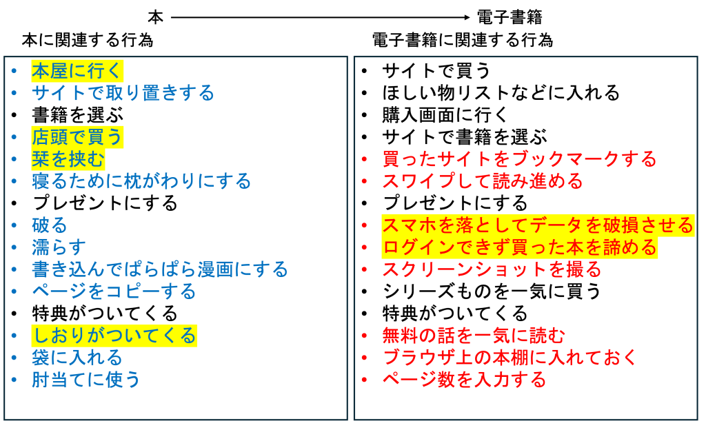 我々が提案した手法では,問題点に気づかせるために行為の増減変化というものを提示しています.例えば,本から電子書籍に便利になった場合,栞を挟むという行為や本棚に置くという行為がなくなって,スワイプしてページを捲るという行為や端末を充電するという行為が生じます.このような増減の変化を提示しました.