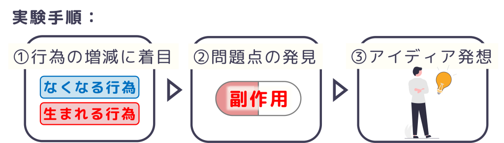 実験では行為の増減の変化を自分で考えるか提示してもらうかによる影響を調査しました.その内容として,問題点に未然に気づくときの影響とその問題点を防いだアイディアのブラッシュアップのときの影響を調査しました.そのモノでどのような行為があったかな?と思考することで,より問題点に気付けたりいいアイディアを考えることができると仮定していました.