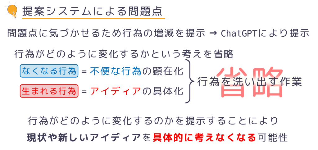 「なくなる行為が何かあるかな?」という思考は,今の現状に対して不便と感じる行為を明らかにするということ.「生まれる行為があるかな?」という思考は,今から生み出すアイディアに対してどういうモノにしようかなとアイディアを膨らませるということ.この思考をAIに任せるのは果たして良いのか??ということです.