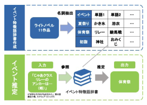 イベントを推定するために本研究では,イベントが発生するとイベントに関連する語(以下,イベント特徴語と呼びます)が出現するという仮定をたてました.イベント特徴語とは例えば,学園ジャンルの体育祭では「リレー」や「借り物競走」,「騎馬戦」といった単語が,また夏祭りでは「花火」や「浴衣」,「下駄」といった単語になります.こういったイベント特徴語を手掛かりとしてイベントの推定を試みました.