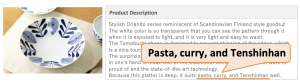 ECサイトでは以下の画像のように,商品説明文に記載されているその器に盛り付けると良いとお薦めされている料理名の例がそれにあたります.
