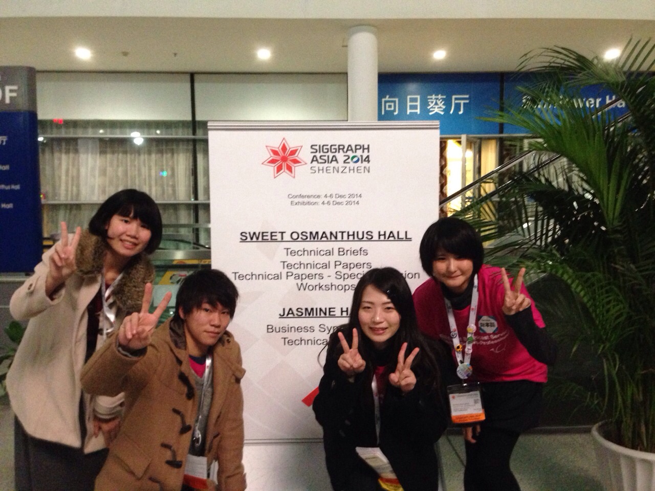 2014年12月3〜6日に、中国の深圳でSIGGRAGH ASIA 2014が開催されました。松下ゼミからは、阪口さん(D1)、山田さん(B3)、岩崎くん(B3)、櫻井さん(B3)の4人が参加しました。今回はEmergent Technologies カテゴリで Slanting Shadowの展示と行ったのに加えて、現地での学生ボランティアを行いました。3回生にとっては初の国際学会参加であり、不慣れな英語で説明しなくてはならなかったため、少し不安もあったようですが、結果的に貴重な経験になったと思います。初日からスーツケースがロストするなど波乱万丈な旅でしたが、それも含めて忘れがたい発表の機会になりました。