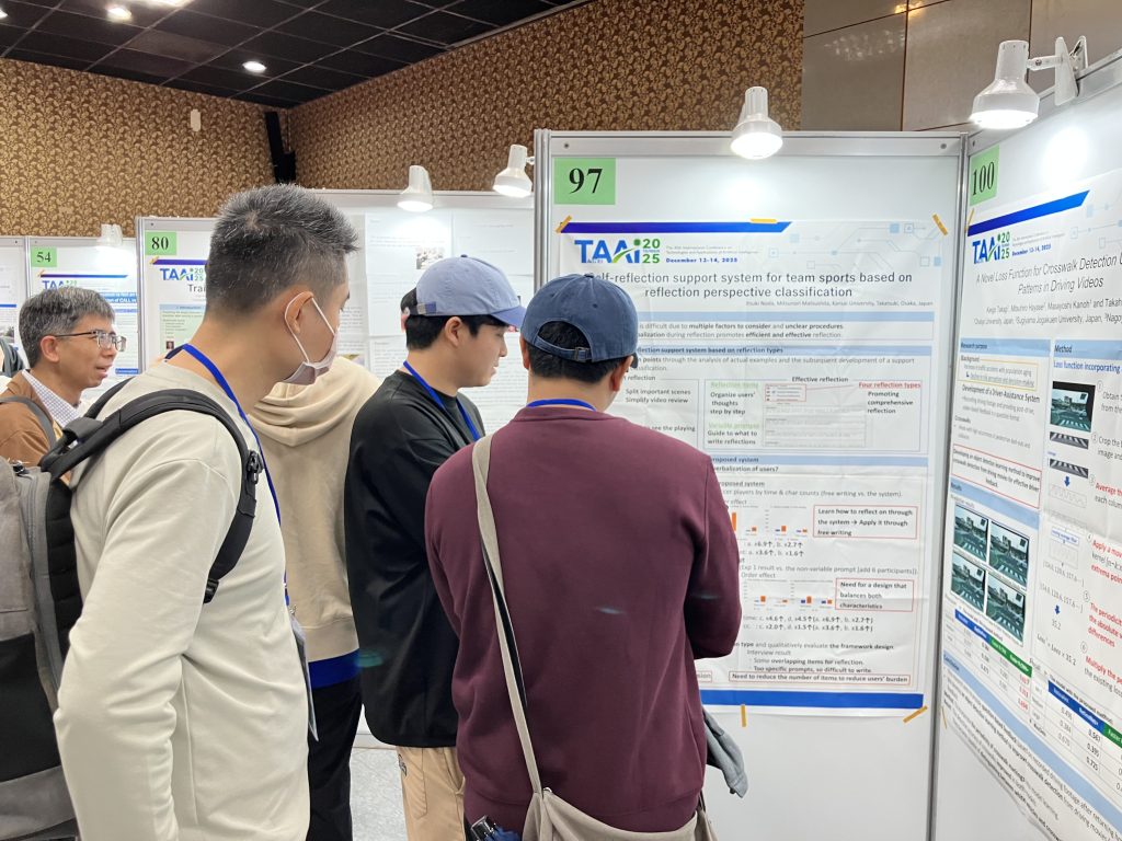 皆さん,こんにちは.寒すぎて布団から出られないM1の野田です.今回は2025年12月13日(土),14日(日)に,台湾の台北市にある国立師範大学で開催されたTAAI2025にて,「Self-reflection support system for team sports based on reflection perspective classification」というタイトルでポスター発表をしてきましたのでその報告をさせていただきます.